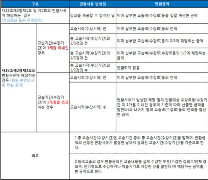 주1. 교습기간(수강기간)이 종료된 경우는 반환하지 않는다.