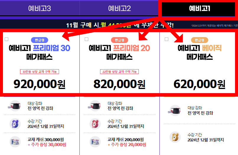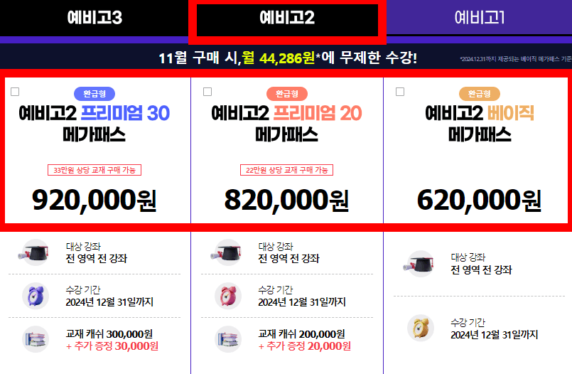 고1과 고2까지는 가격이 비슷한데 고3이 되면 가격이 좀 올라간다. 올라간 만큼 메가패스 가격도 올라간다. 찾아보시면 수능을 앞두고 부족한 과목에 대하여 학원을 다니기도 그렇고 메가패스 단과를 끊고 집중 공부해서 등급을 올렸다는 블로그 글을 심심치 않게 찾아볼 수 있다.