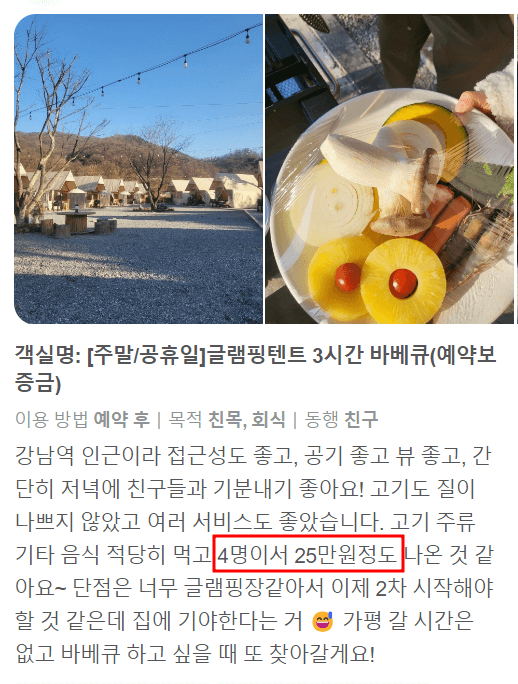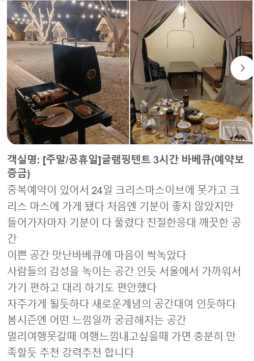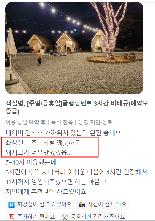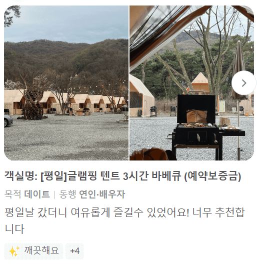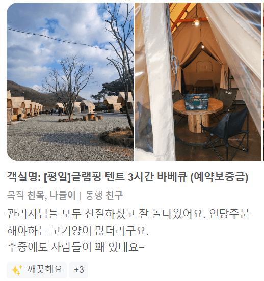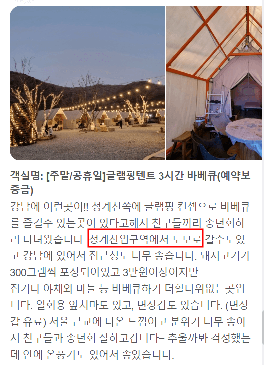 검색 유입을 보니까 제가 쓴 글 중에 글램핑 유입 있는 것 같아서 이 부분에 대하여 좀 자세한 후기를 쓰려고 합니다. 글램핑을 가려고 하는데 시설은 어떻고 거리는 어느 정도 인지 궁굼해 하시는 분들이 많아서 서울 지역 글램핑을 이용한 고객님들의 솔직한 후기를 남겨드리려고 합니다.