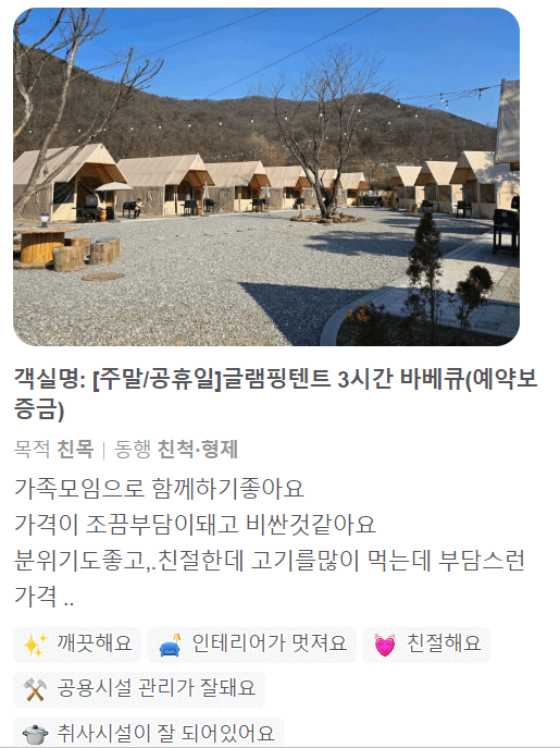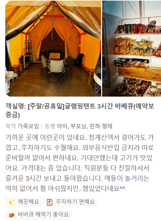 | 글램핑: 서울근교 가족캠핑장 이용자들 솔직한 후기 ver.1 (0) | 2024.04.15 |