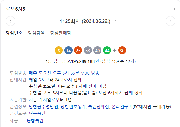 1. 목요일 날 로또 제1125회 당첨 결과입니다.