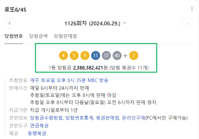 1. 목요일 날 로또 제1126회 당첨 결과입니다.