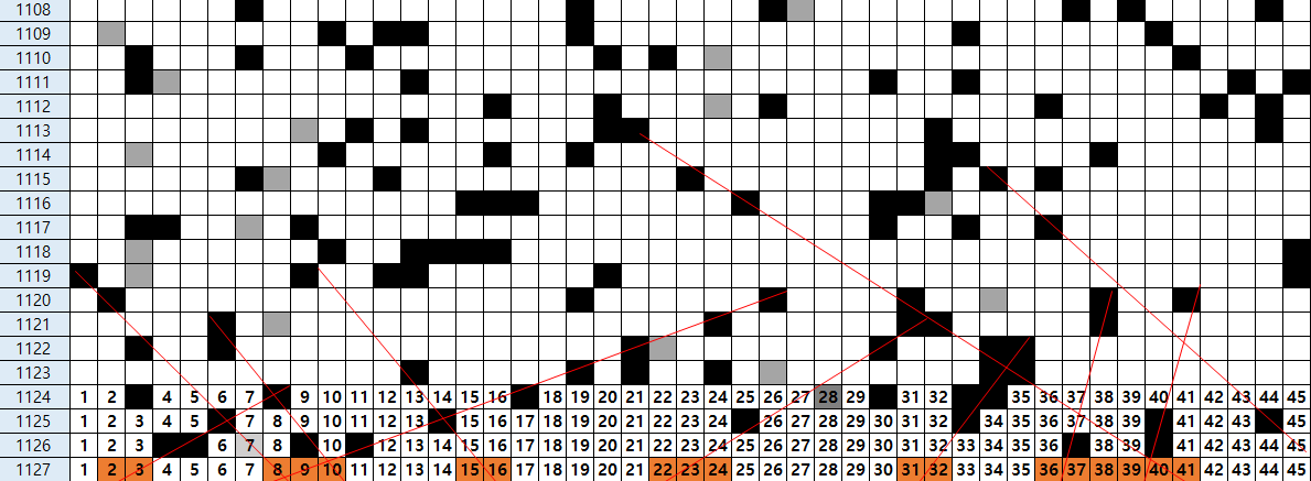 ◼️1번대는 점점 왼쪽으로 향하는 번호와 오른쪽으로 향하는 기운으로 나뉘어 있네요. ◼️ 10번대는 뜬금없는 10번과 15,16번 ◼️ 20번대에는 22, 23, 24 연속번호입니다. ◼️ 30번대에는 31,32 그리고 36, 37, 38, 39 ◼️ 40번대에는 40 41 입니다. |