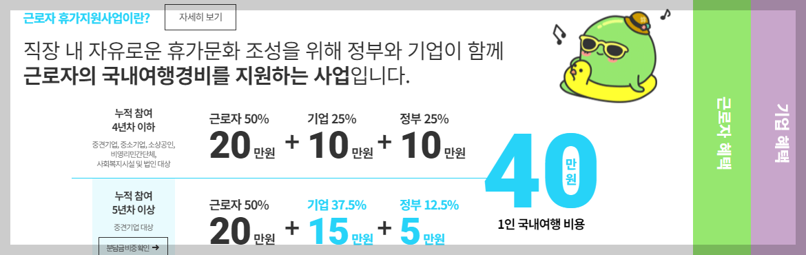 고용노동부와 한국관광공사가 협력하여 근로자의 휴가 비용을 일부 지원하는 제도입니다. 근로자가 일정 금액을 적립하면 기업과 정부가 추가로 지원금을 더해주는 방식입니다.
