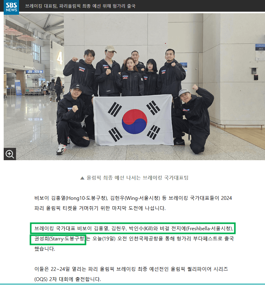 한국 브레이킹 국가대표 선수들이 2024년 7월 열리는 파리 올림픽 대회를 위해 헝가리고 출국을 했습니다. 이번 파리 올림픽 대회에는 남자부 김헌우(36, Wing), 김홍열(38, Hong10), 박인수(31, KILL)와 여자부 전지예(24, Freshbella), 권성희(27, Starry)가 출전을 확정 지었습니다.
