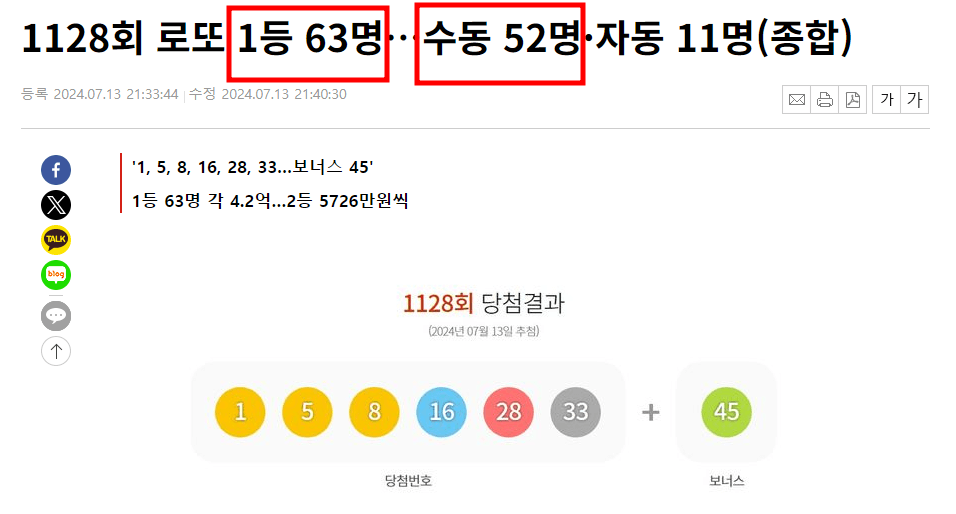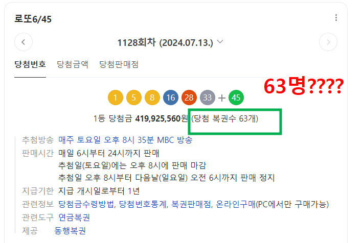 지난 주 1128회 1등 63명이 나왔습니다. 63명!!!!