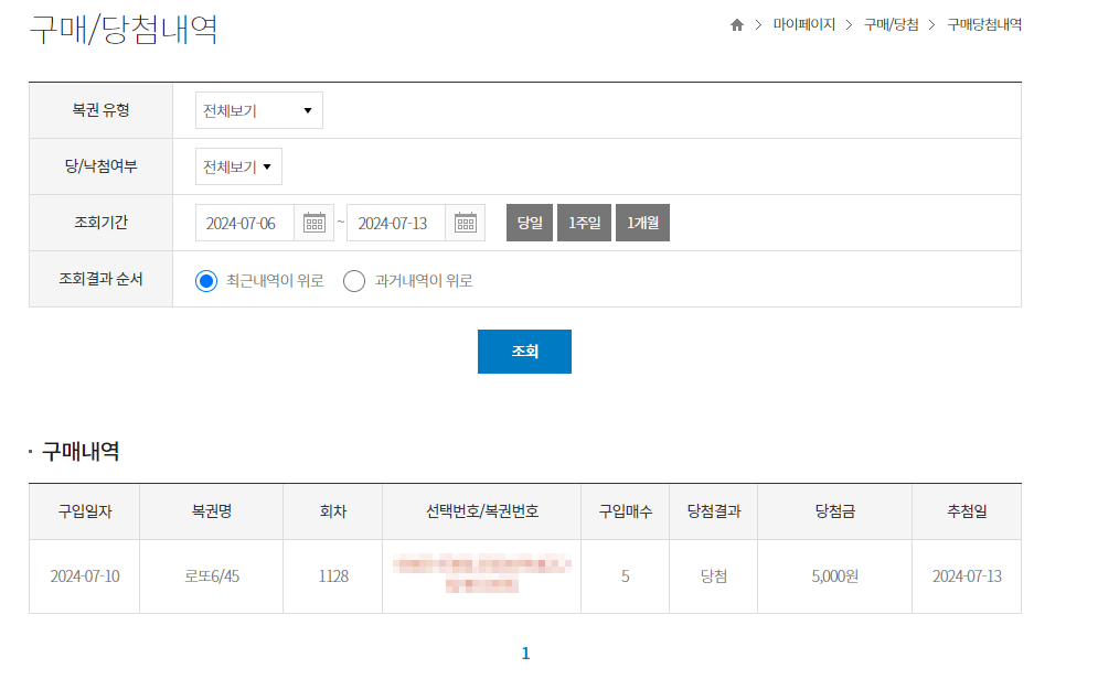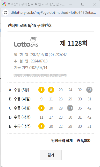 이번 주는 5등 1개 당첨되었네요.