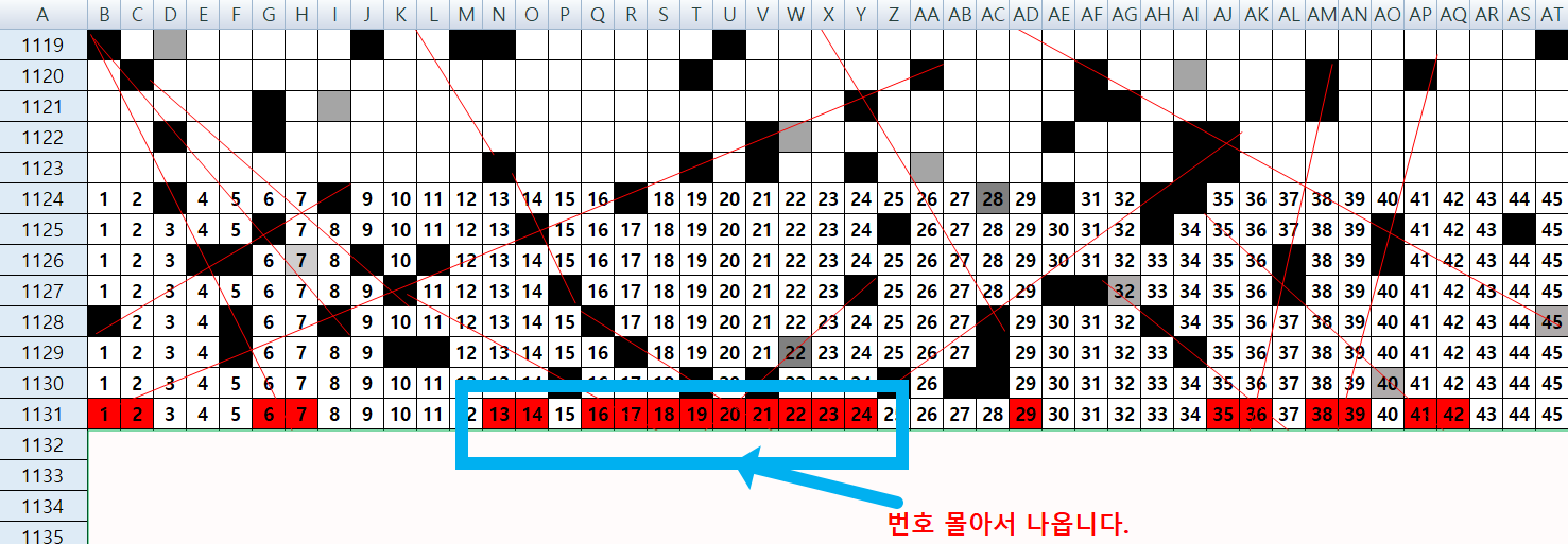 ◼️1번대는 점점 왼쪽에서 오른쪽으로 향하는 기운입니다. 추천번호는 그림과 같이 1번, 2번, 6번, 7번입니다. => 1번, 2번 당첨 ◼️ 10번대는 13번부터 => 14번, 16번 당첨 ◼️ 20번대는 20번부터 24번까지 그리고 생뚱맞은 29번 ◼️ 30번대는 35번, 36번, 38번, 39번입니다. => 38번 당첨 ◼️ 40번대에는 41번, 42번입니다. |