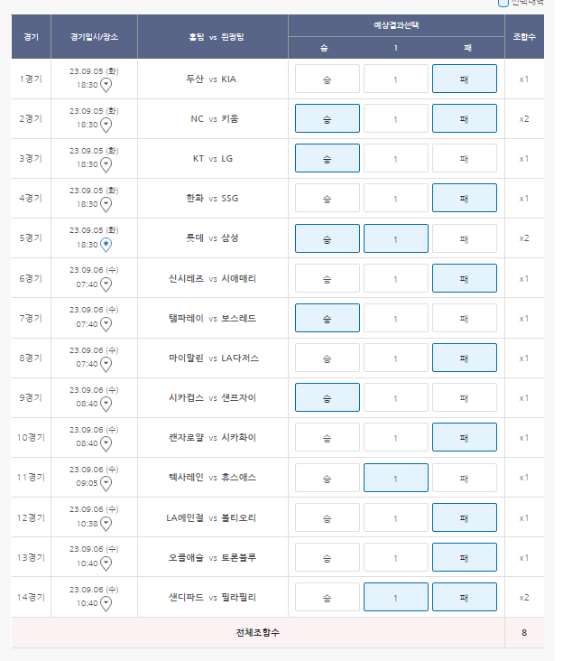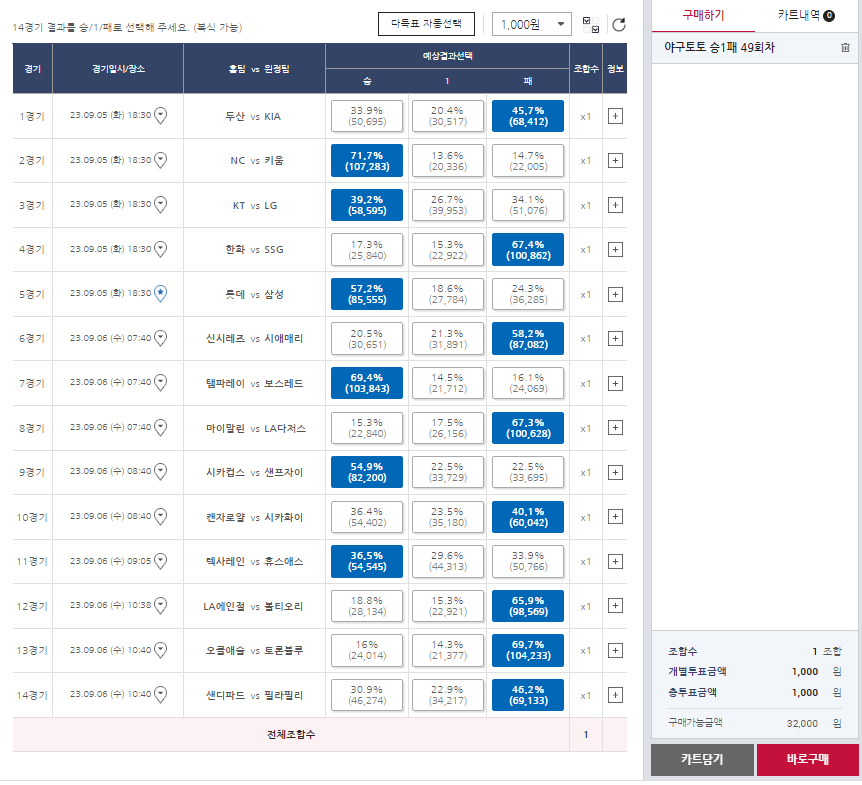 그럼에도 불구하고 소액으로 1만원 정도는 로또 사면서 구입하실 것이라 이왕하는 것이면 그래도 확률적으로 접근을 해야 하는게 맞지 않나 싶습니다. 이번 주도 한번 볼까요? 국내 배당은 의미없다고 생각하는게 정신 건강에 좋고, 해외배당은 그나마 한번 참조할 만한 가치가 있다고 생각됩니다. 그런데 해외구매율은 축구 쪽은 안 그런데 야구는 정말 늦게 떠요. 오늘이 마감일인데 미국야구는 내일 경기라 그런지 승1패가 마감되기 직전인 오후 정도에 뜨나봐요.