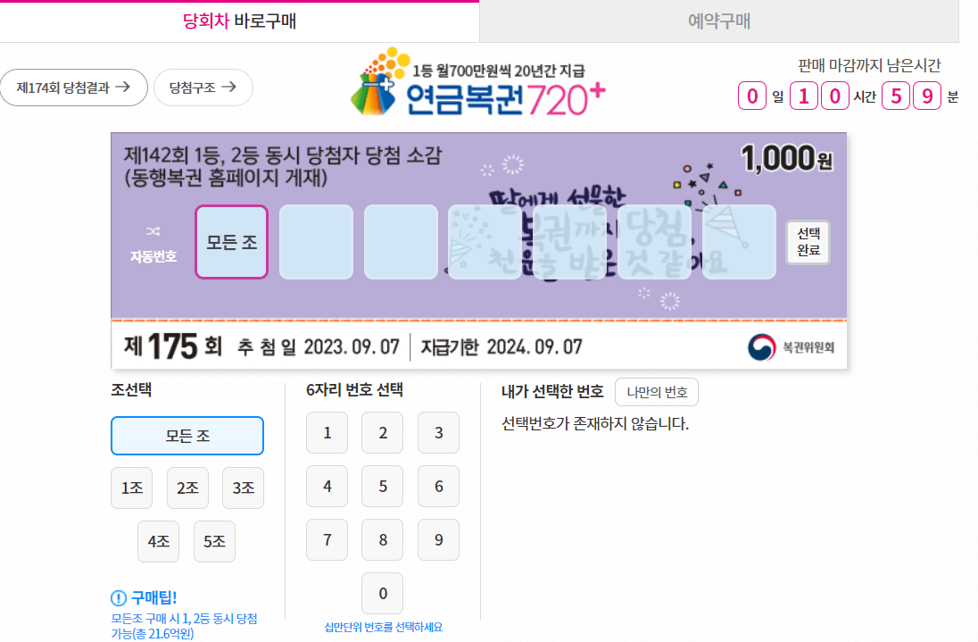 연금복권 720+는 1등 당첨번호와 다른 번호로 2등 당첨번호와 동일한 번호를 가지고 있습니다 5개조를 모두 사면 1, 2위를 동시에 차지할 가능성이 크다. ※5개 그룹을 동일한 번호로 모두 구매 시 1등(20년 월 700만원) + 2등 4매(10년 월 100만원) 동시 당첨 가능