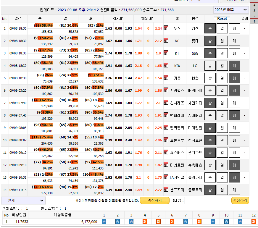 소액으로 1만원 정도는 로또 사면서 구입하시는 것을 추천드리며 이번 주도 한번 볼까요? 국내 배당은 의미없다고 생각하는게 정신 건강에 좋고, 해외배당은 그나마 한번 참조할 만한 가치가 있다고 생각됩니다. 그런데 정배로만 들어와도 1등이 이렇게나 적습니다. 그만큼 야구는 맞추기 힘든 스포츠입니다.