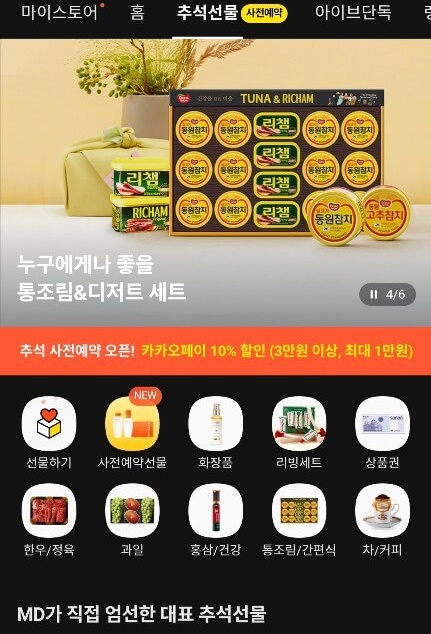 올 해는 어떤 선물이 유행하는 지도 알아봐야겠지만, 추석 같은 명절에는 과일 말고도 한우 같은 고기류나 통조림, 식용유 같은 부담 없는 선물세트도 시장에 많이 나와있으니 이런 제품들도 미리 카카오톡 모바일 상품권으로 사두는 것이 좋을 것 같다.