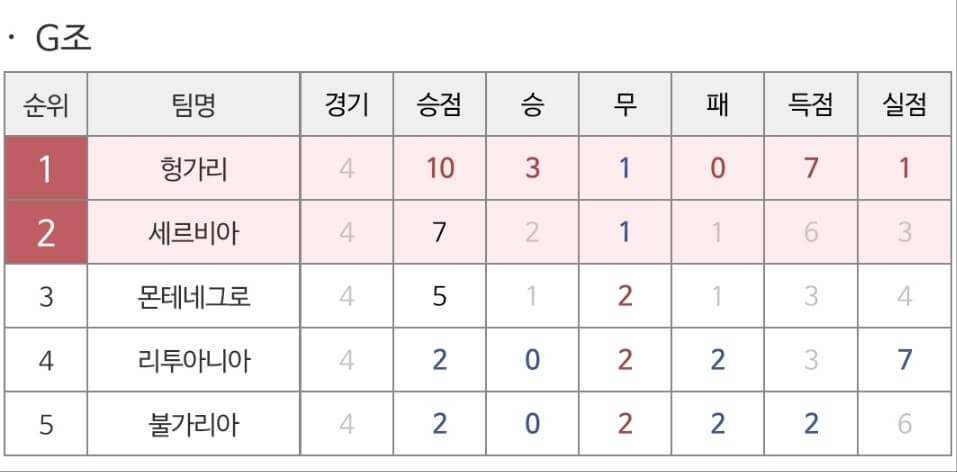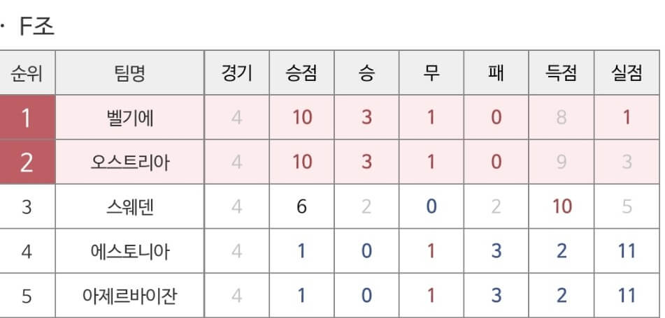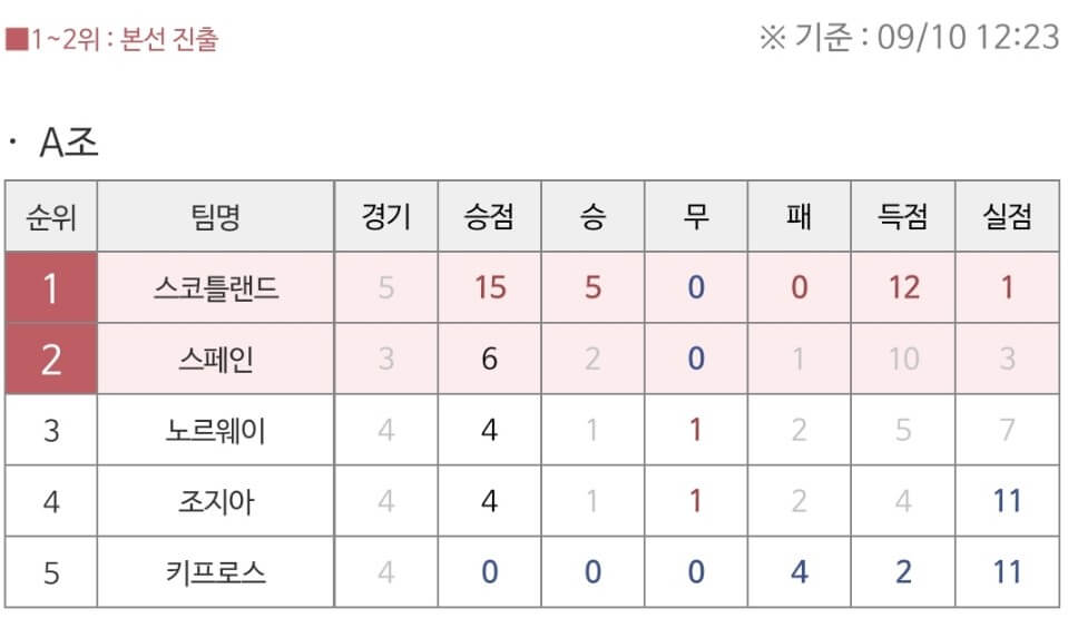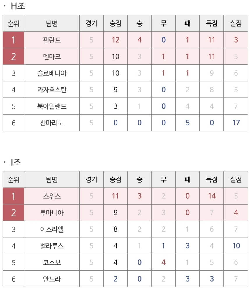 일단, 지난 주말까지 끝난 2024유로 예선 경기 결과들을 올려드렸습니다. 실력차가 극명하죠? 상위 1위와 2위 팀만이 진출을 하기에 이미 포인트 차가 많이 나기에 경기가 계속될수록 상위팀은 앞으로 후보 선수를 내세울 것이 분명해 보여 다음 주부터는 정배가 정배처럼 보이지 않을 경기가 많아질 듯합니다.