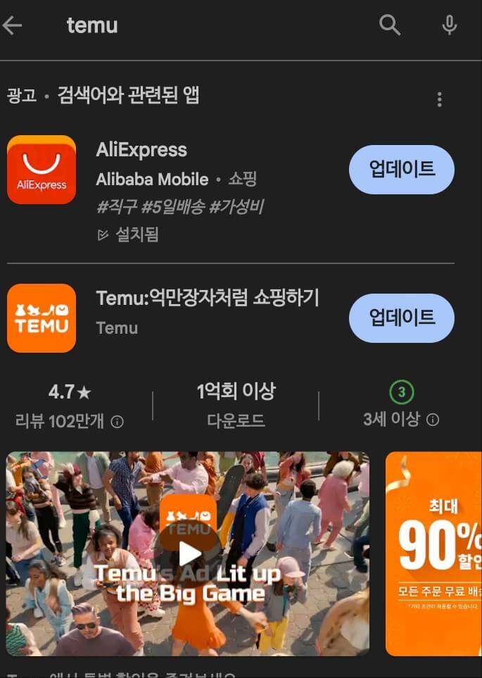 본론으로 들어가서 테무(temu)와 알리익스프레스(Aliexpress)가 어떤 회사인지 그리고 어떤 정책을 펴는지에 대해서는 위에서 설명을 하였으니, 이제는 테무(TEMU)와 알리익스프레스에 대해 공통점과 차이점에 대하여 이야기를 해보겠다. 구글 플레이 스토어에 가서 테무를 검색해도 알리와 같은 화면에 순서만 달리해서 뜬다. 그것도 바로 아래에 뜬다. 혹시 연관된 회사인가 싶은 생각이 들겠지만, 전혀 아니다.