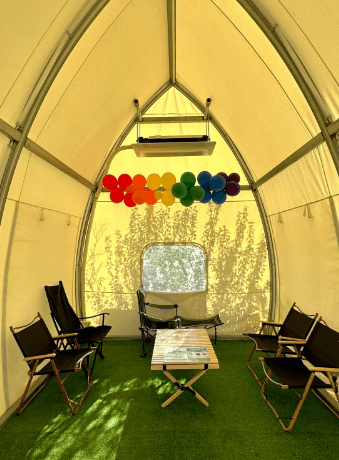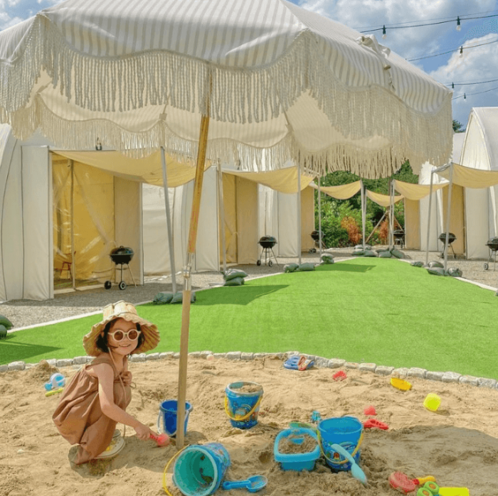 모레존놀이 텐트와 물놀이존 텐트가 따로 있어서 원하는 곳에 에약을 하는 시스템으로 운영이 되며 한 여름날에는 텐트안에 에어컨이 있어 편안히 쉴 수 있으며 한 겨울에는 난방시스템이 있어서 아늑한 분위기에서 캠핑을 할 수 있다.